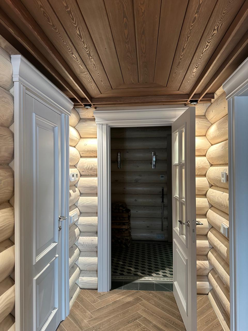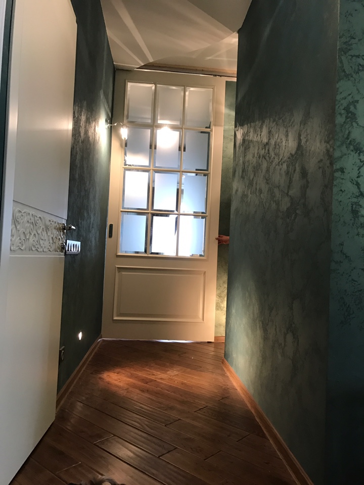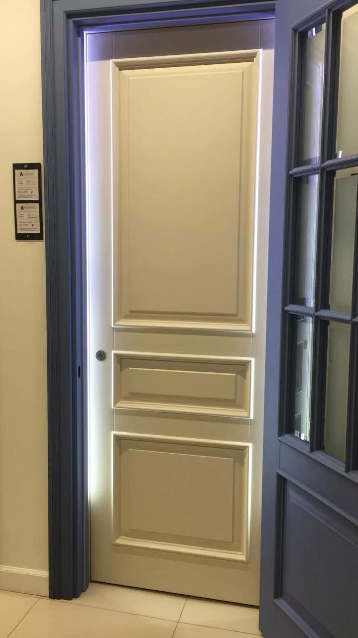 Полотно тамбуратное из инженерного массива (МДФ + ламельный/листельный массив лиственных пород) толщиной 50 мм. с повышенной шумоизоляцией,окра шенное матовыми красками итальянского производства SIRCA с эффектом «soft touch» по шкале RAL с возможностью двусторонней окраски. Объемные филенки, стекла крепятся к полотну с помощью фигурных штапиков (багетов).