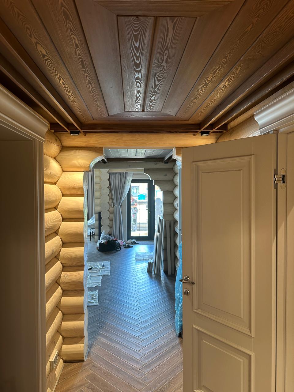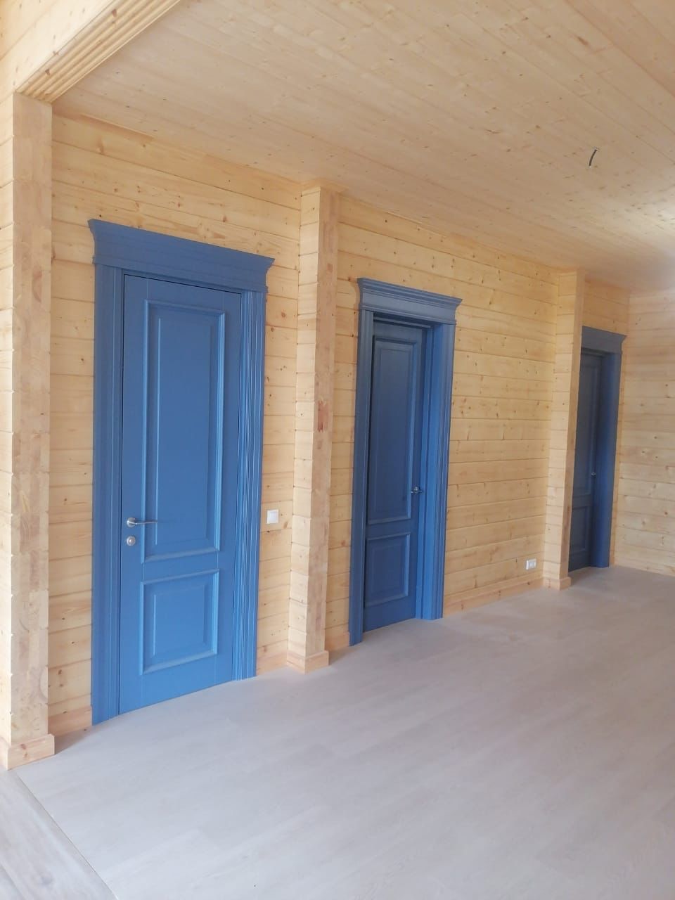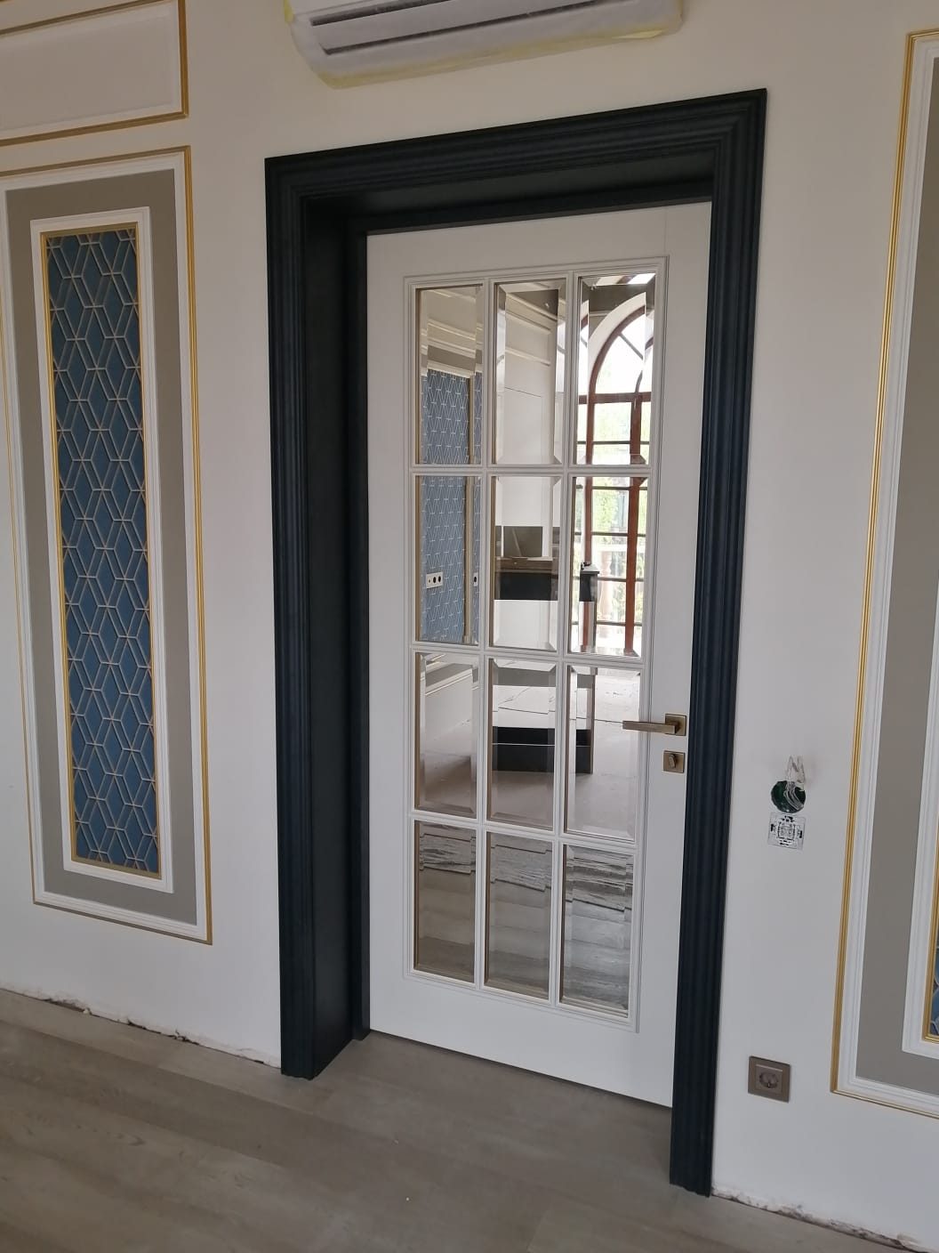 Полотно тамбуратное из инженерного массива (МДФ + ламельный/листельный массив лиственных пород) толщиной 50 мм. с повышенной шумоизоляцией,окра шенное матовыми красками итальянского производства SIRCA с эффектом «soft touch» по шкале RAL с возможностью двусторонней окраски. Объемные филенки, стекла крепятся к полотну с помощью фигурных штапиков (багетов).