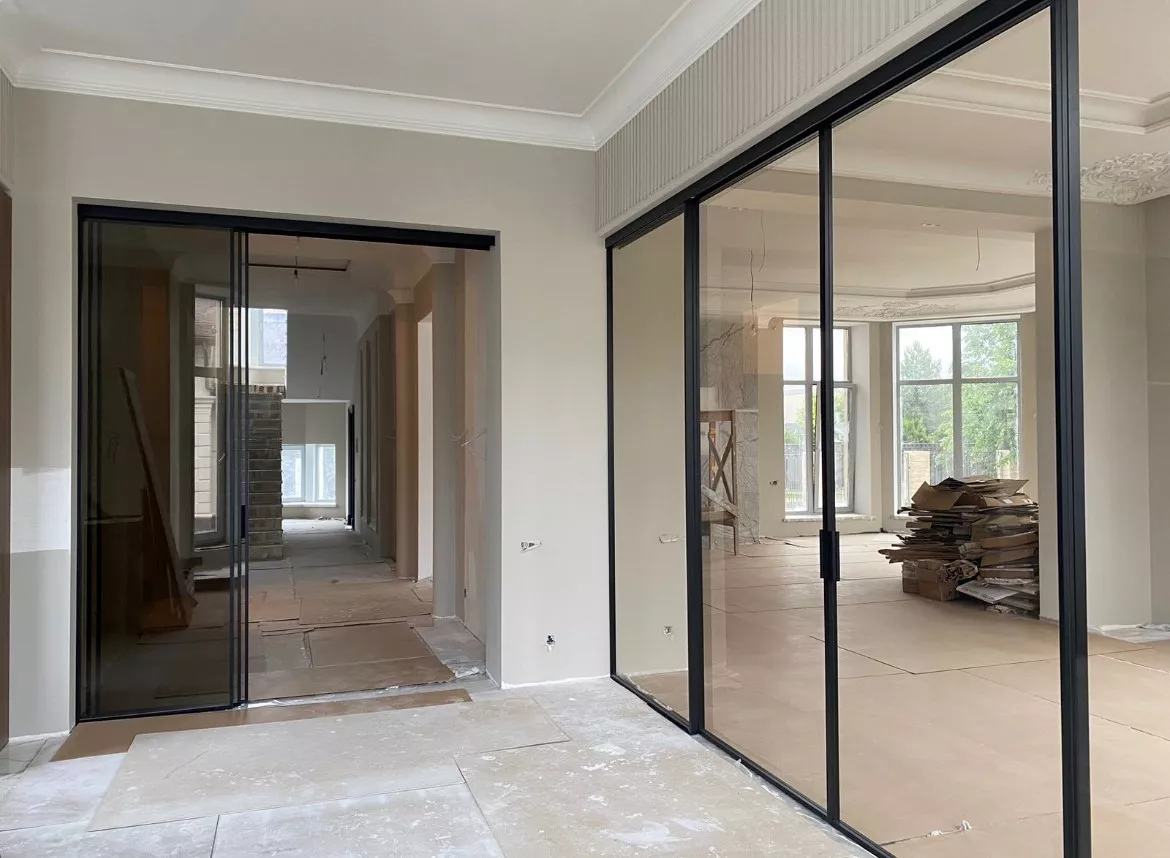 - Складные («книжка» из 2 или 4 полотен): Отличный вариант для широкого проема. Дверь в собранном виде может оставаться внутри проема (открывание на 90 градусов) или уходить на пристенок справа или слева от него (открывание на 180 градусов).