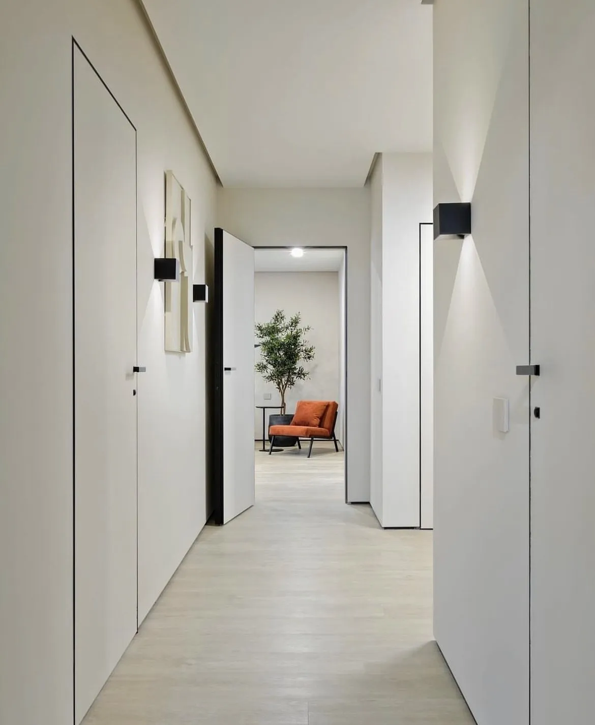 • Визуальное расширение пространства: Белый цвет обладает способностью зрительно увеличивать помещение, делая его более светлым и просторным. Гладкие двери, особенно в сочетании с минималистичной обстановкой, создают ощущение свободы и простора.
